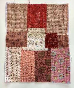 今回は、端切れの中から赤系の布でチクチク波縫いをして